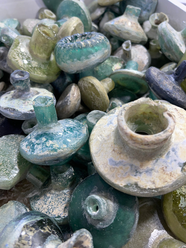 This Gorgeous "Sea Glass" looking bead is called Roman Glass due to its origin on the Silk Road. While the perfume, oil, and other goods that were carried in these shards are long gone, we are left with a reminder of the vibrant trade practices in Biblical times and the great lengths people went to for goods we can readily receive.
